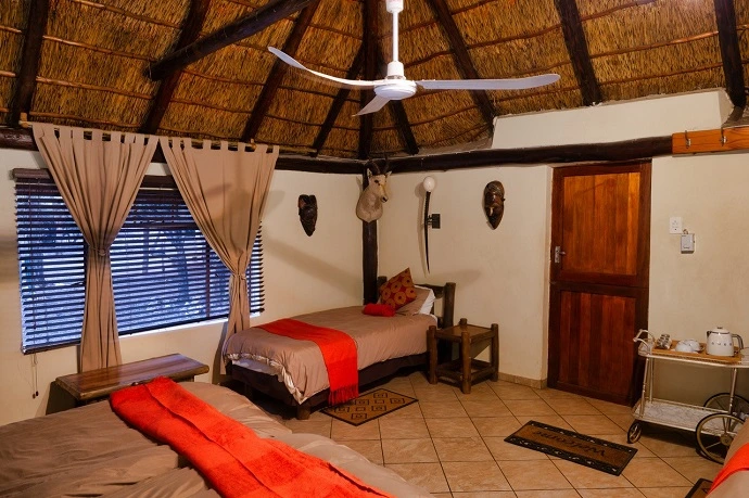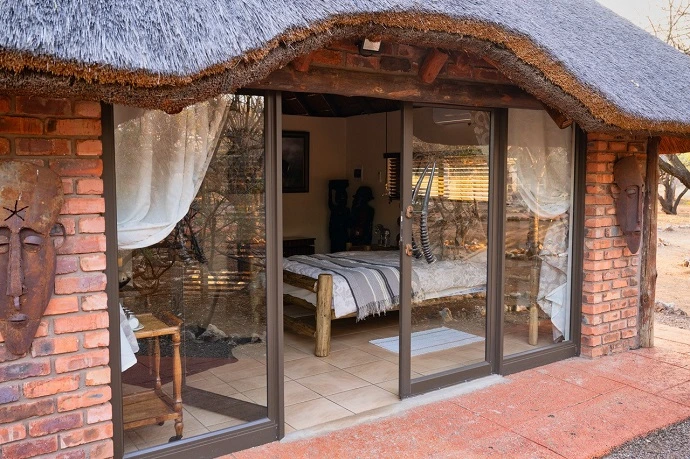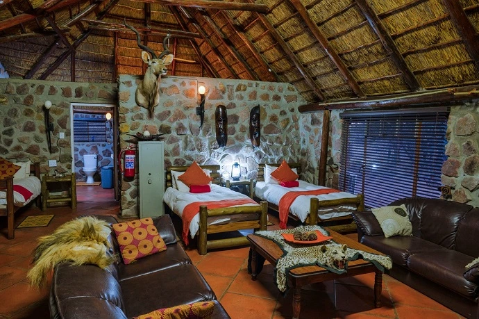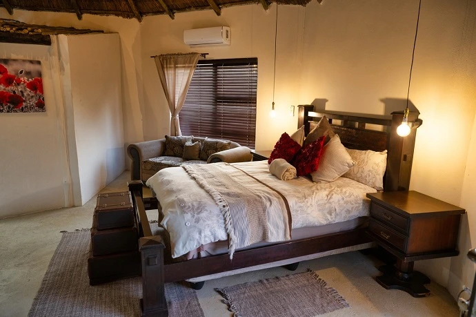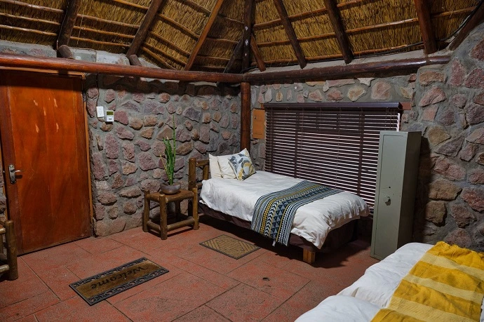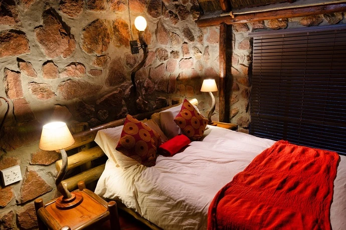 The buildings are built from natural stone and cement with thatched [grass] roofs. The chalets are fully serviced daily. Linen, duvets, extra blankets, towels, soap and shampoo are available. Comfortable beds, bed lamps and warm friendly African atmosphere in the camp. Eating around a fire in the lapa and open dining area or in the dining room in the main lodge, depending on weather conditions.